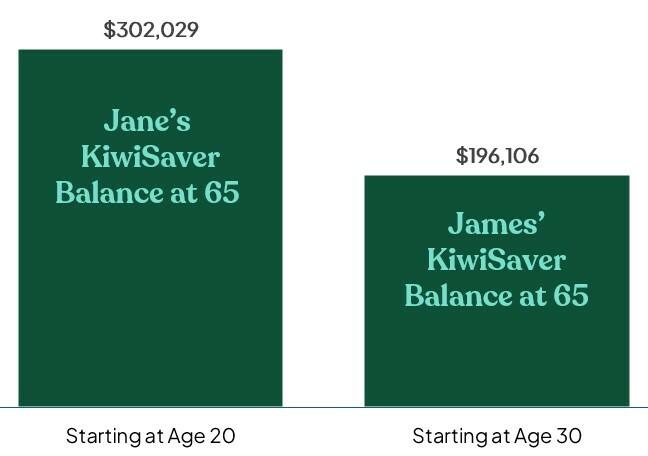 Here’s a simple example to illustrate this. Jane and James both have an annual salary of $50,000. Jane starts contributing 3% of her salary at age 20 to her KiwiSaver account whereas James starts contributing the same amount at age 30.